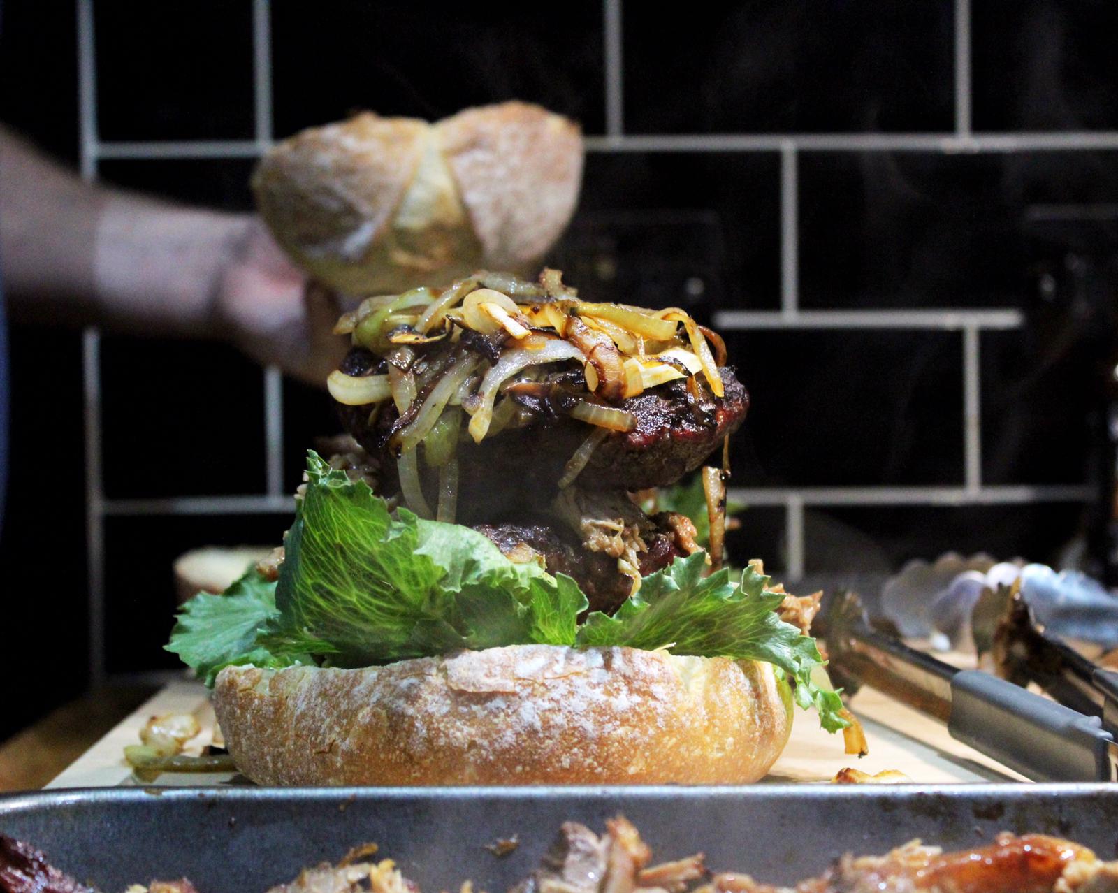 I used two whole Sour dough cobb loaves as burger buns each with two especially made giant homemade beef patties, lettuce, fried onions to create this showstopper which we dramatically cut into quarters at the dinner table to many oohs and ahhs.