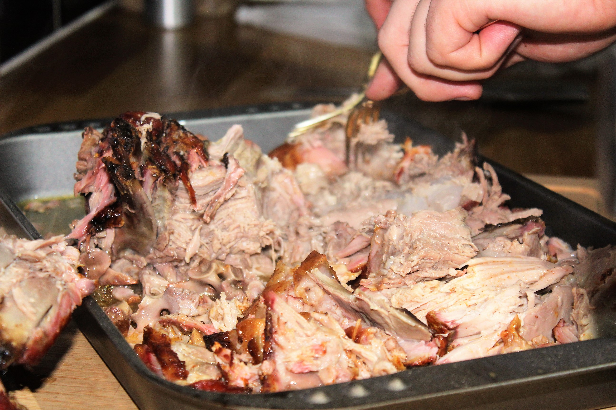 I removed the skin to make crackling and it would have been a waste on the low and slow so I baked this separately at a high heat and for the rest of the day I found myself picking at pork scratchings!