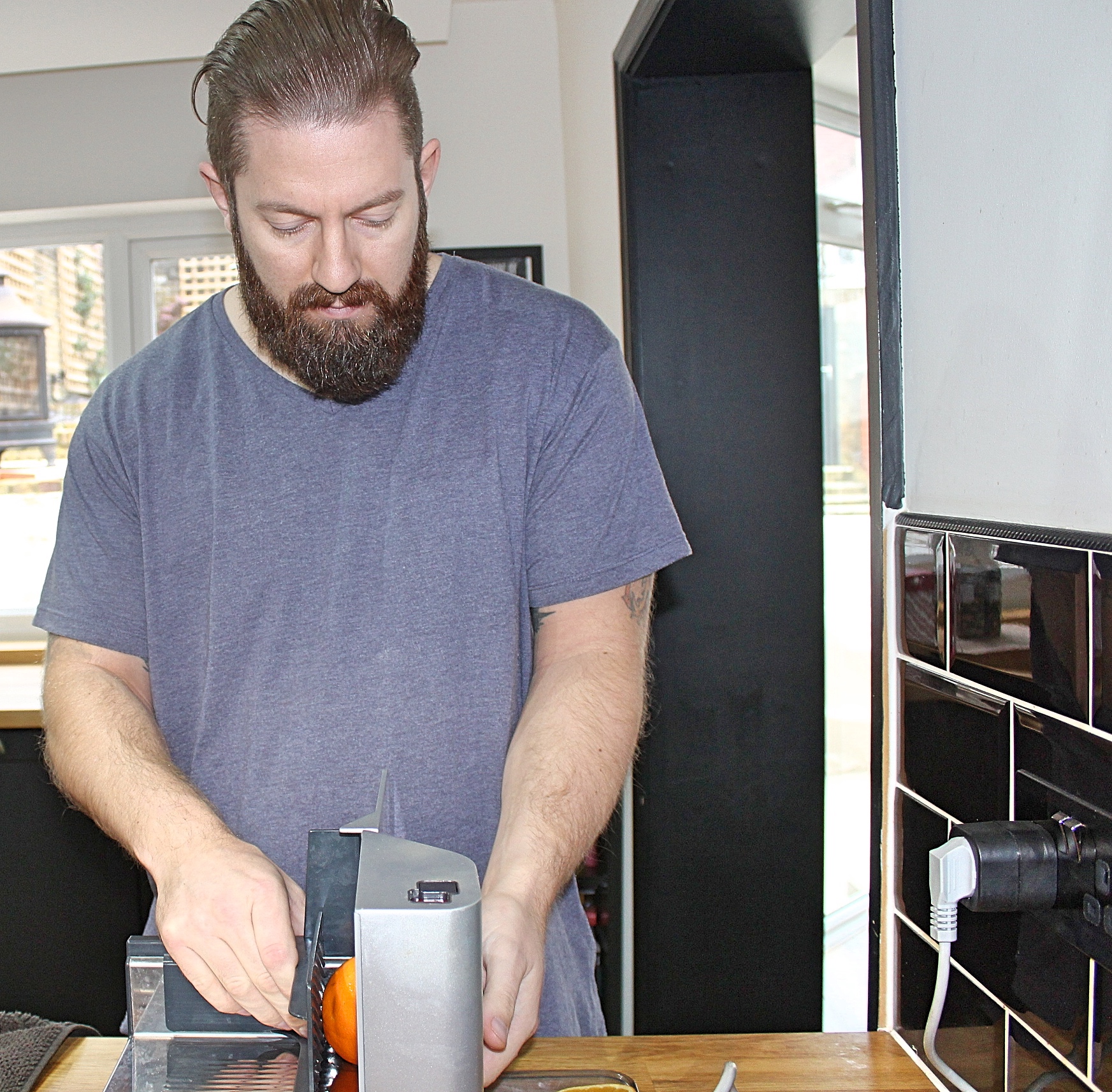 Wash off any wax from the oranges and slice into 3mm thick slices.