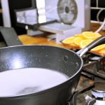 In a wide saucepan add the water and sugar until the sugar dissolves. Bring to a gentle boil but resist the urge to stir to stop the sugar from crystallising.