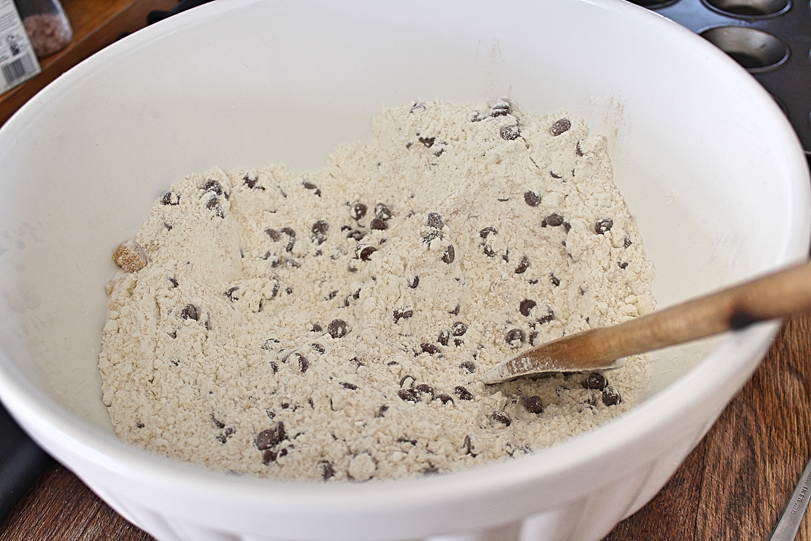 Plonk the flour, sugars, chocolate chips, baking powder and baking soda in a mixing bowl and mix, covering all of those lovely chocolate chips.