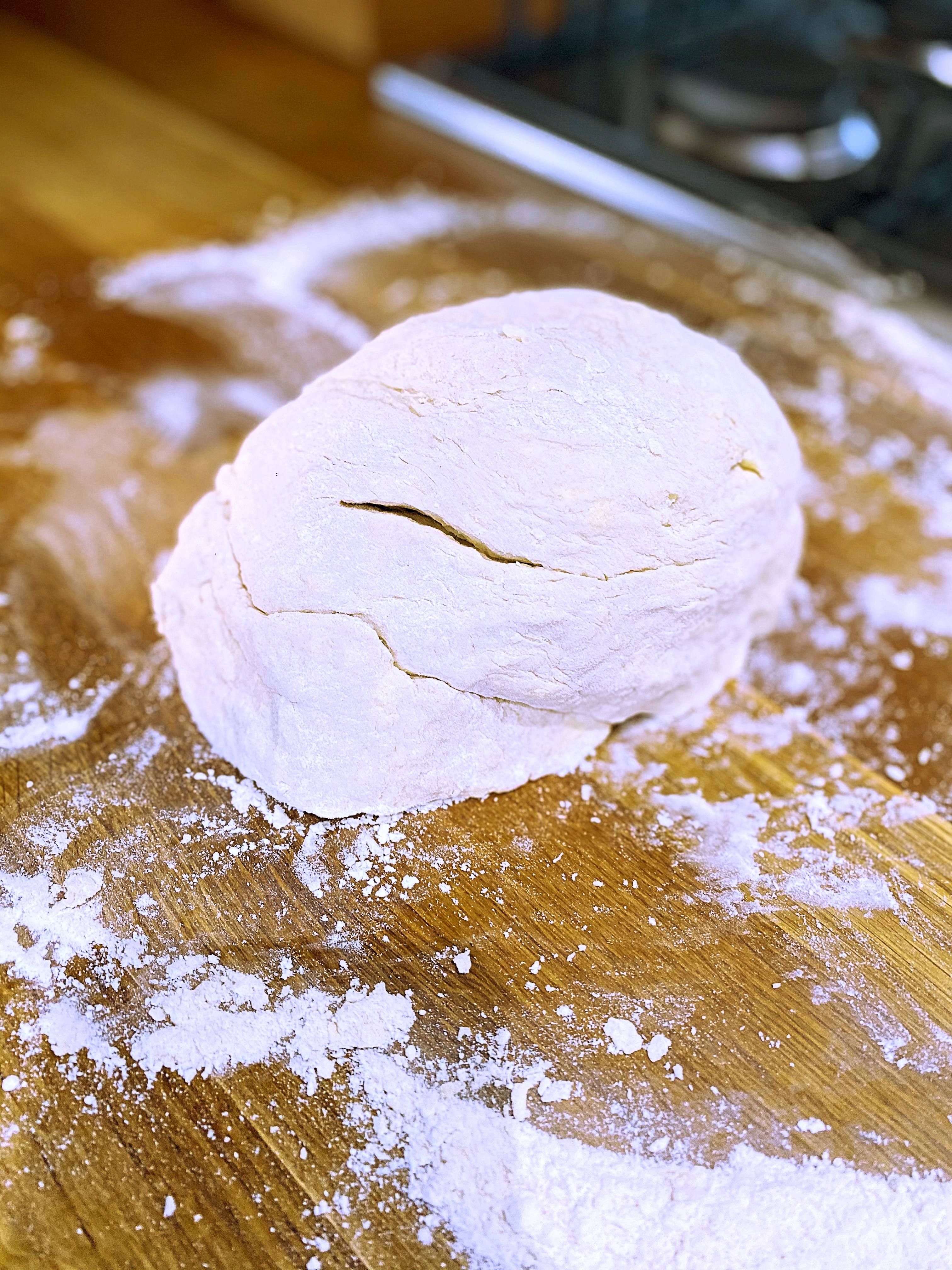Lightly flour your surface and tip out the dough. Use your hands to gently work the dough together, using some flour if it is a bit sticky.