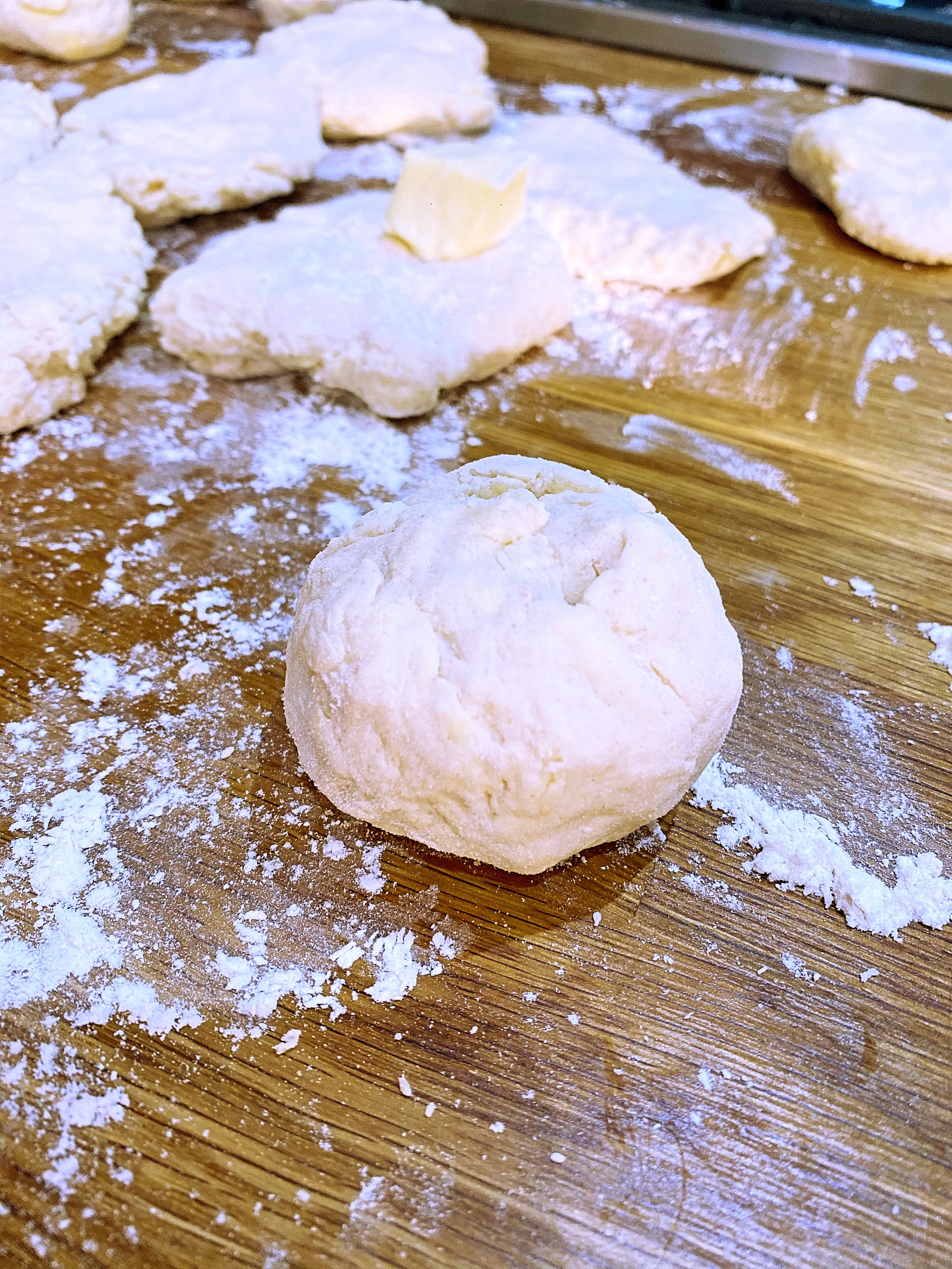 Add a cube to each of the rounds of dough and then close up the dough to encase the brie rolling into a ball.