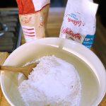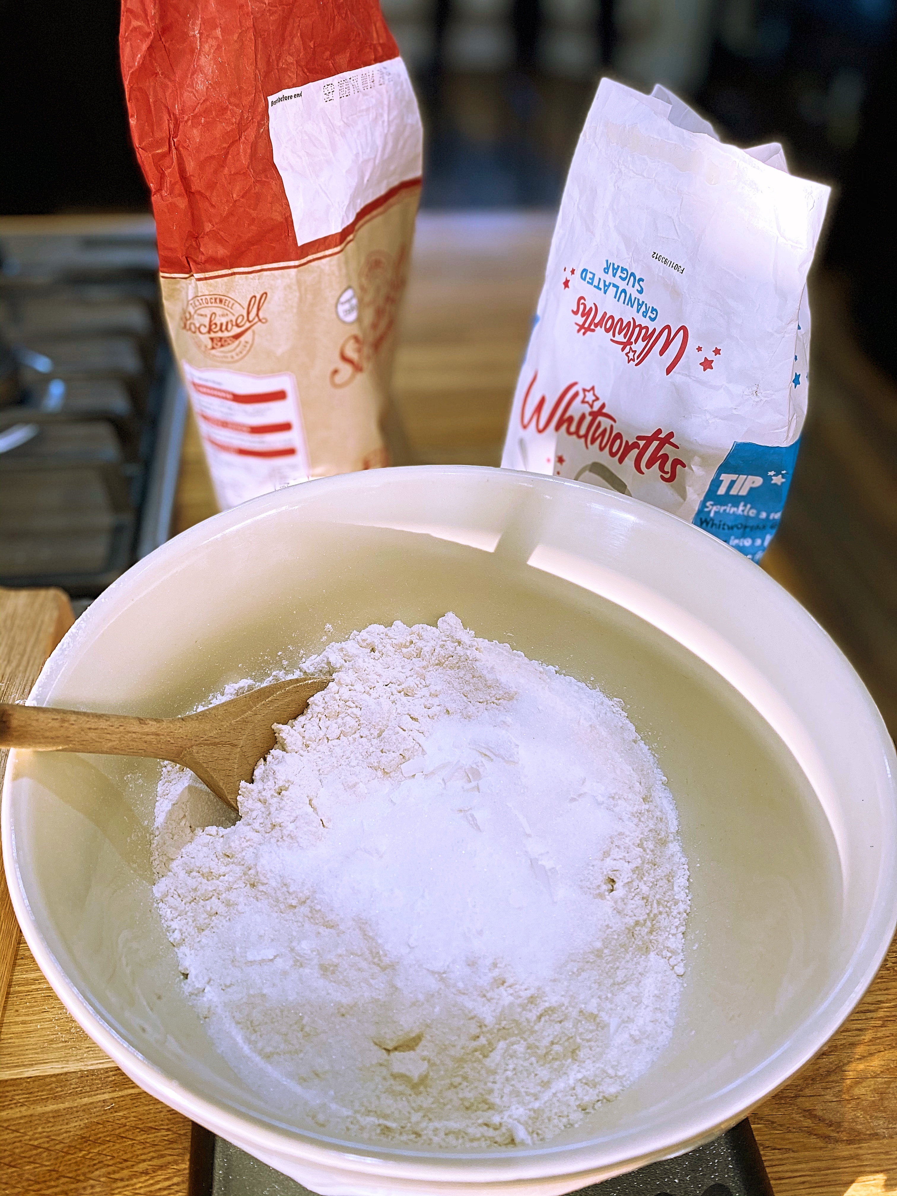Add the flour, sugar, salt and baking powder to a mixing bowl and give it a mix with a wooden spoon.