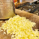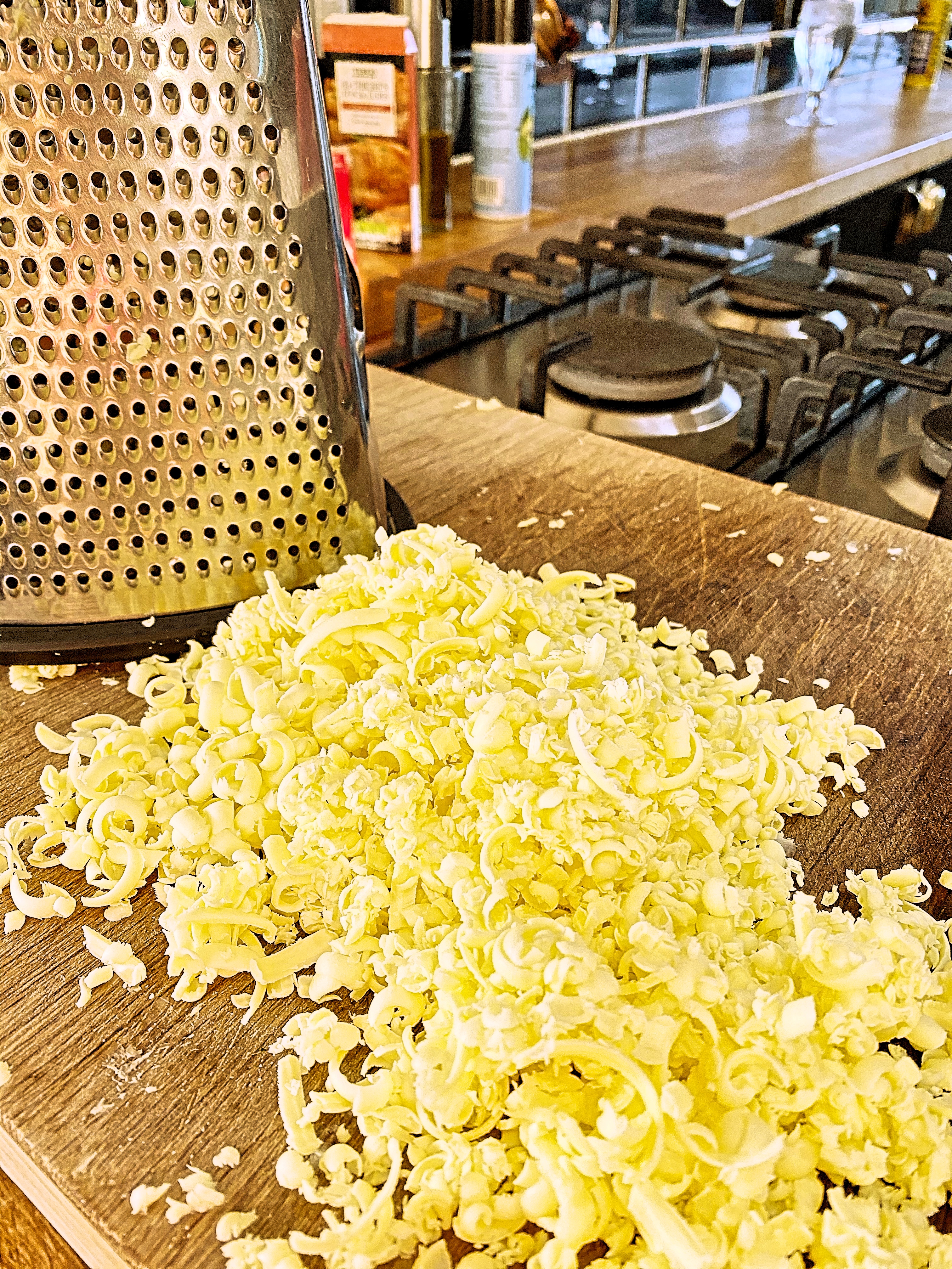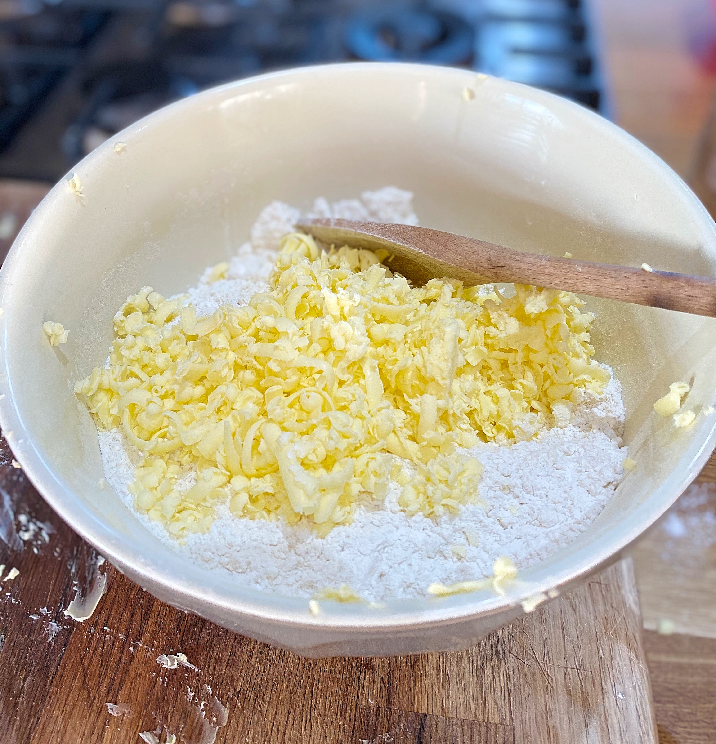 Grate the frozen butter using a box grater. We use frozen butter to keep it as cold as possible which will create an even flakier biscuit dough.