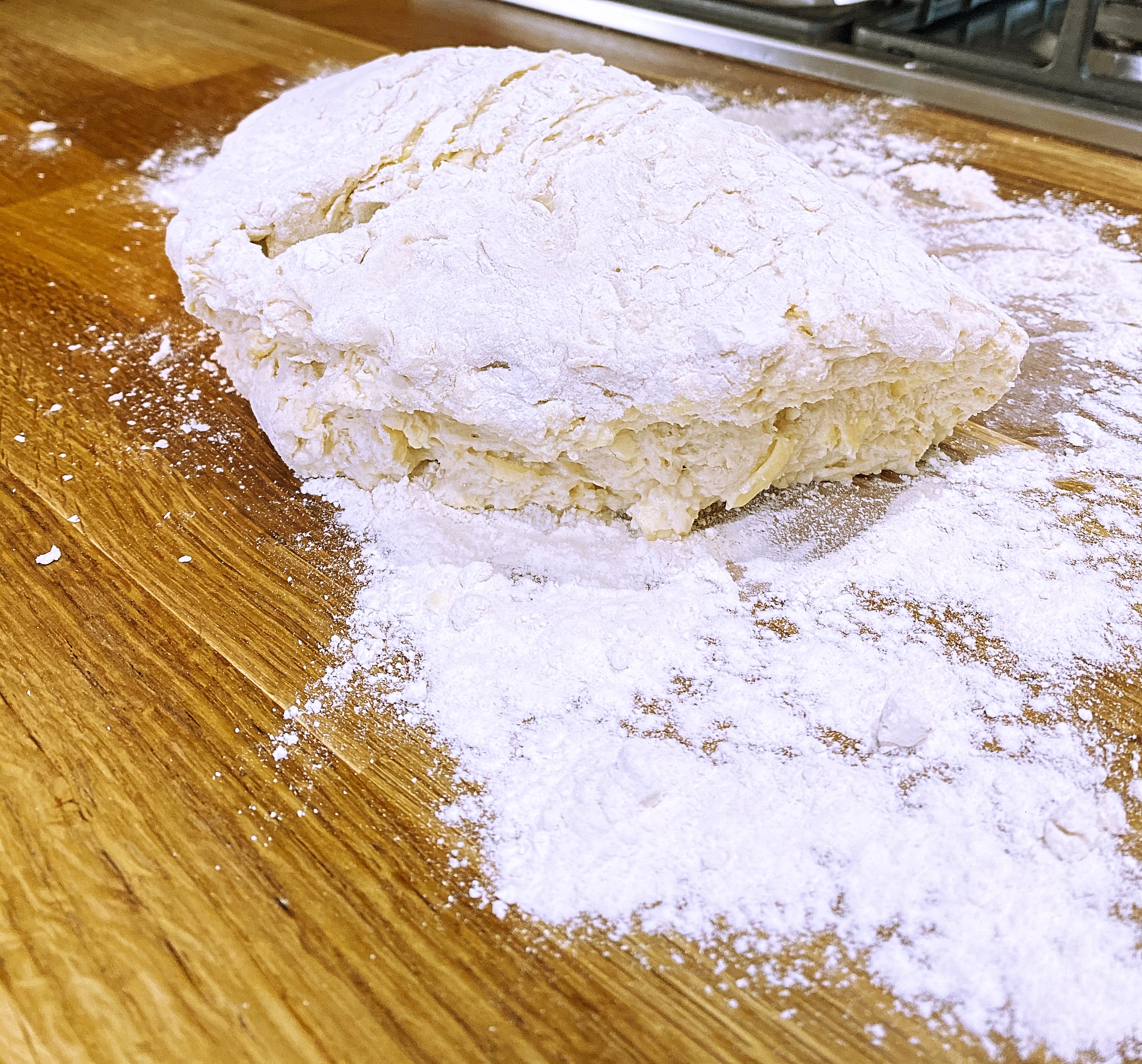 fold the dough in half and flatten with the hands to bind the layers together. Turn the dough 90 degrees and repeat. Repeat this process 6 times creating lovely layers of buttery goodness.