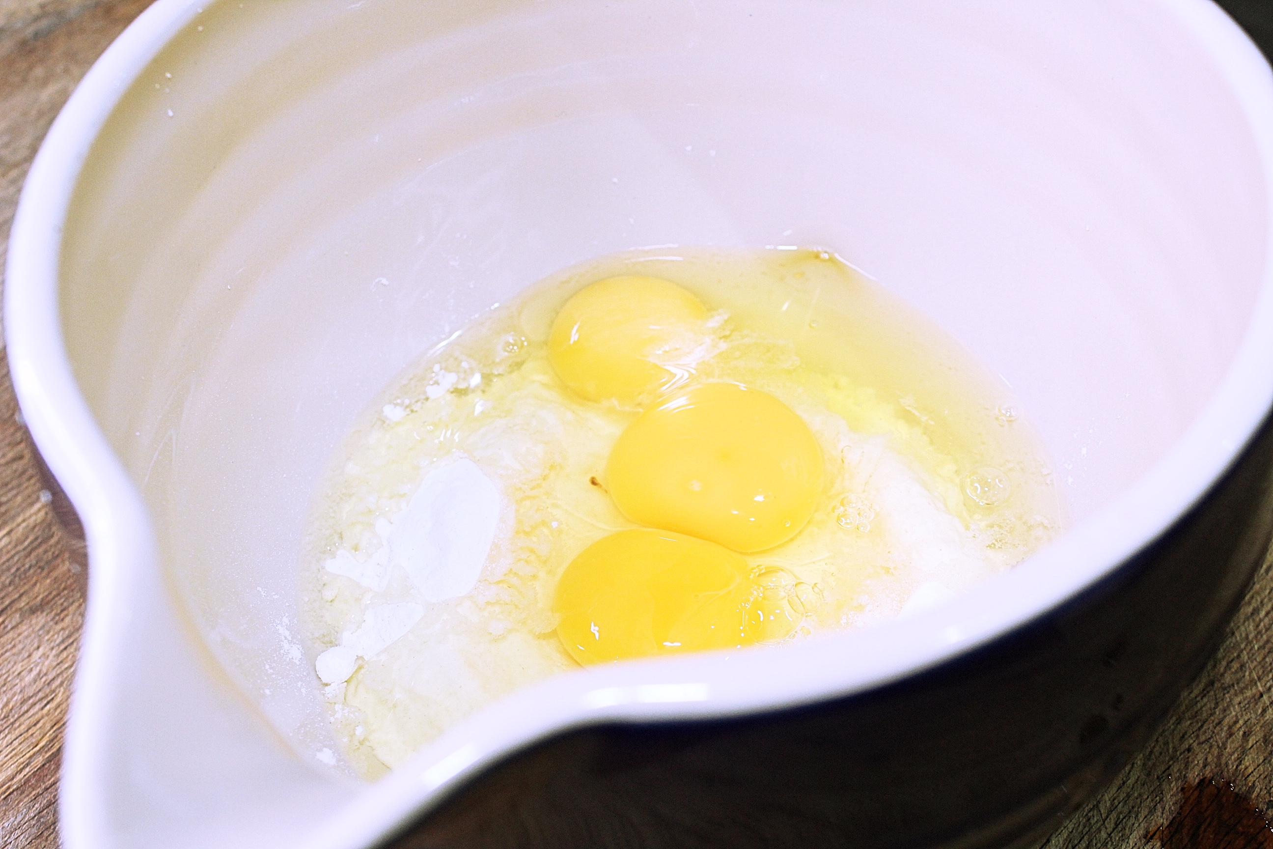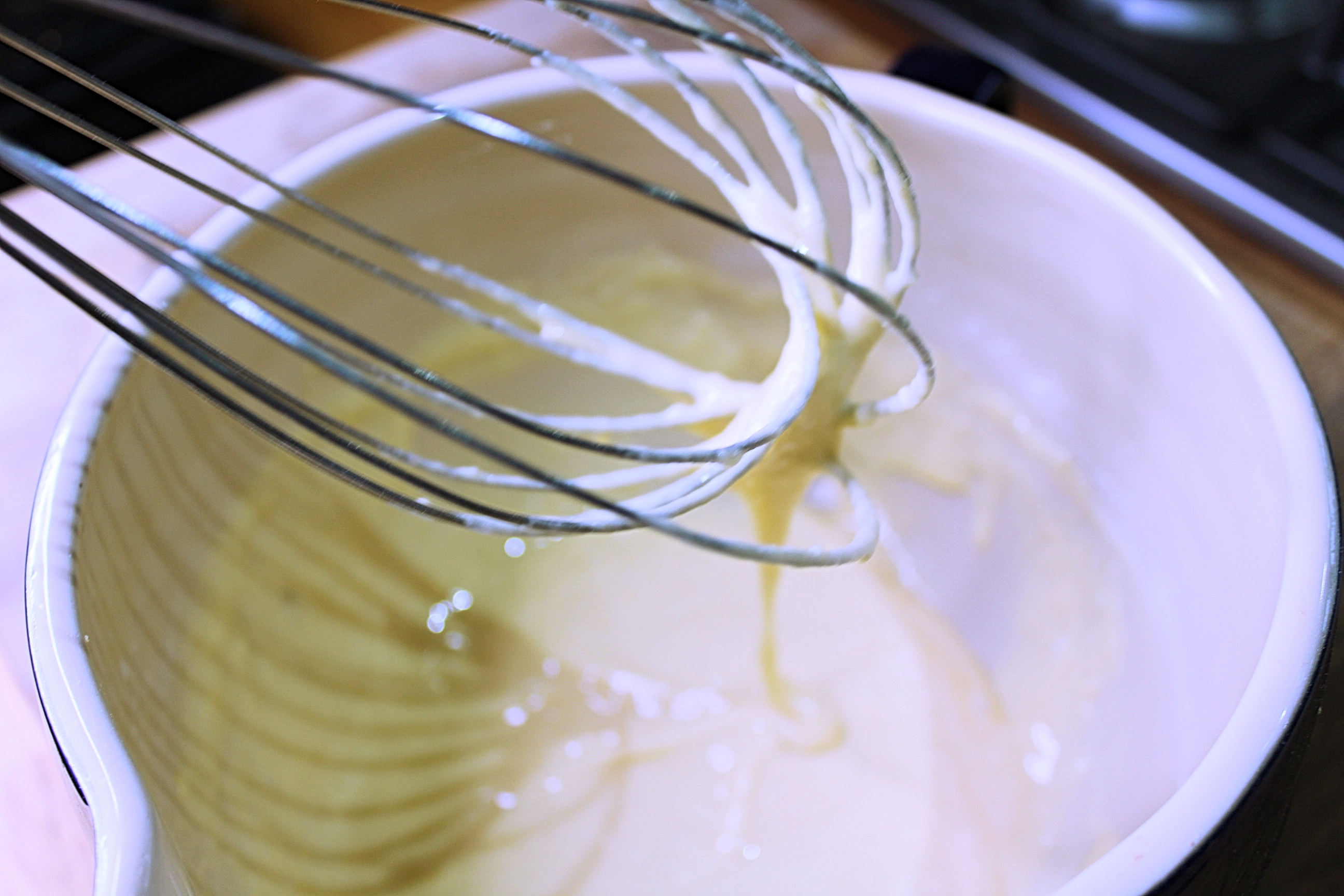 In a bowl, whisk together the flour, salt and eggs, and slowly stream in the milk until you have a creamy, smooth batter.