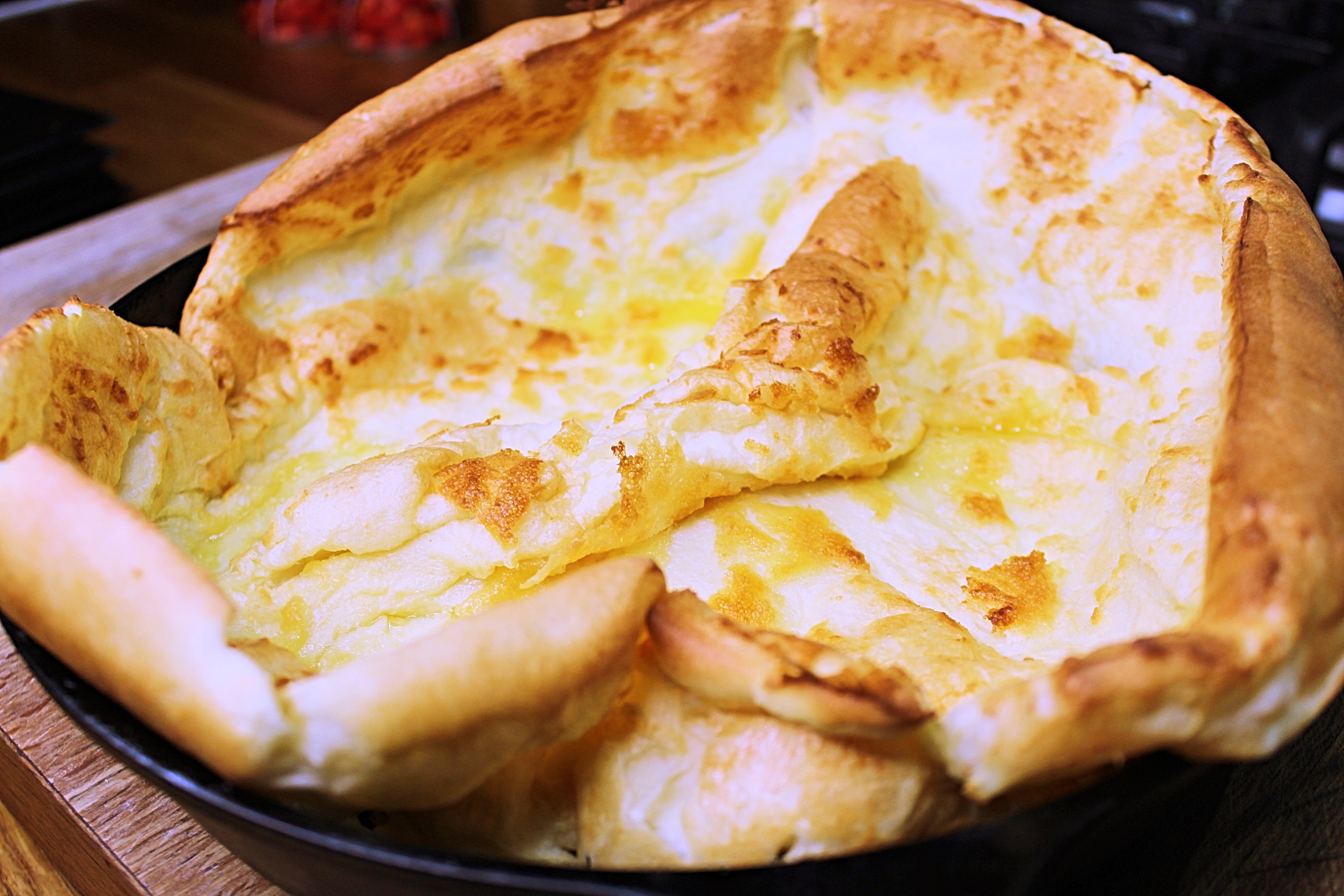 When the butter in the skillet is hot and bubbling take it out, pour in the batter, and place back into the oven. Bake for 16-18 minutes or until hugely puffed up and blooming out of the pan.
