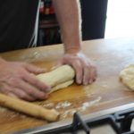 Line a loaf tin with greaseproof paper and punch down your risen dough and fold it in on itself a couple of times. Turn out onto a lightly floured surface, divide it in to three equal pieces and roll each one into a ball.