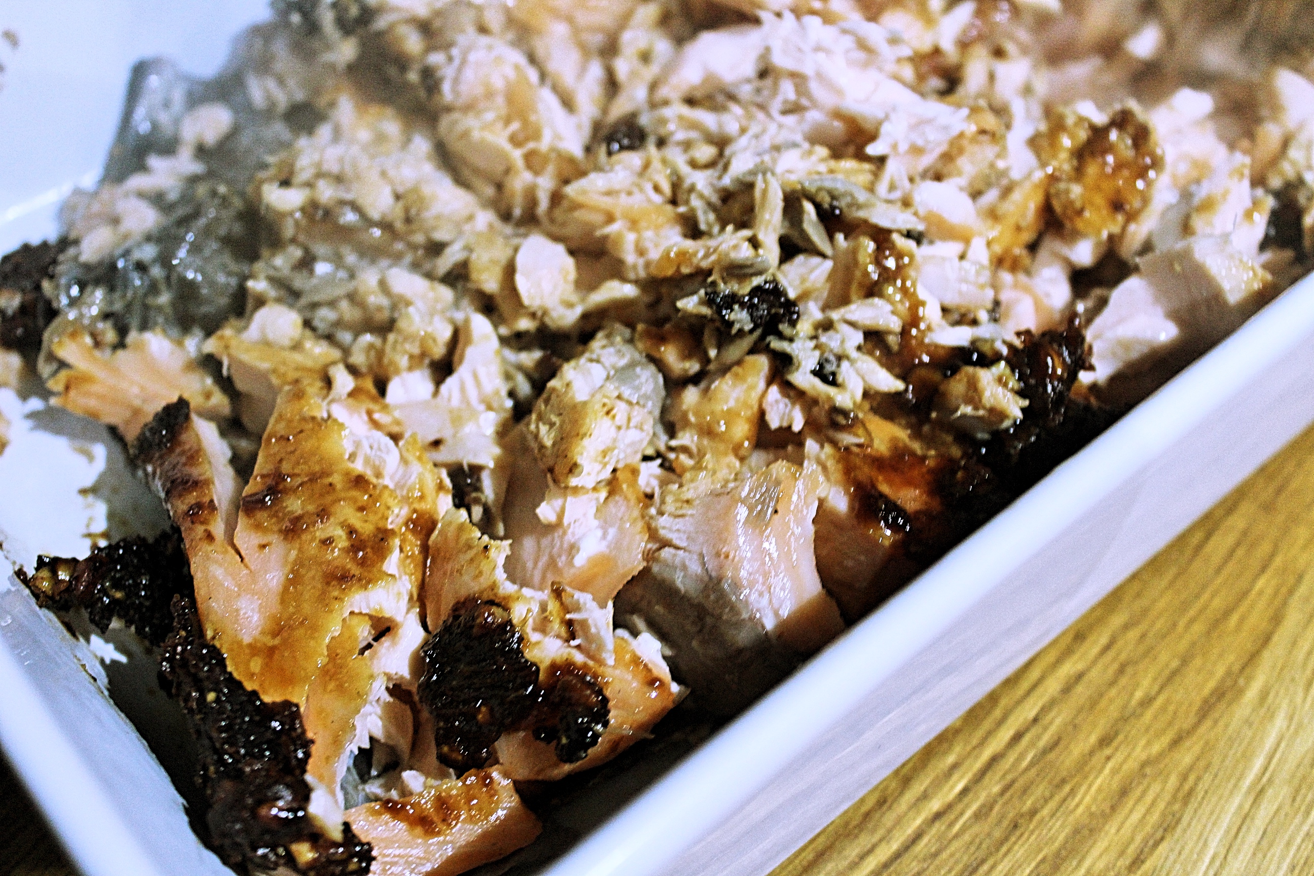 After the additional ten minutes get the salmon off the grill and shred into bite size chunks. Serve with salad and your favourite sides.
