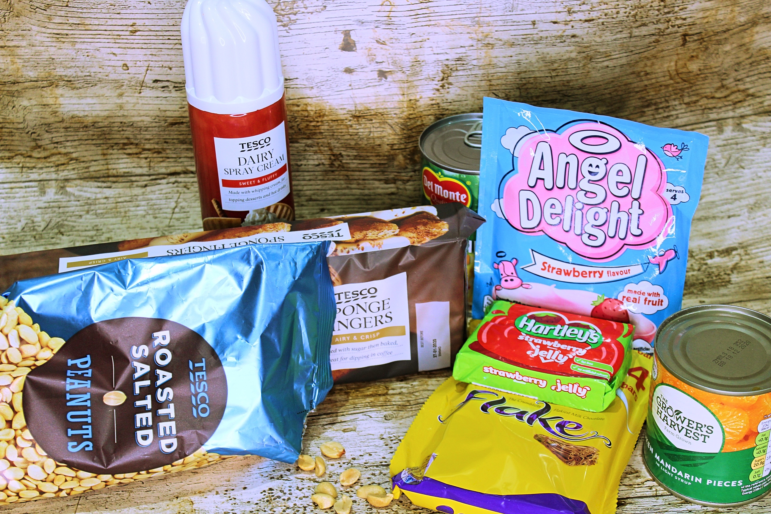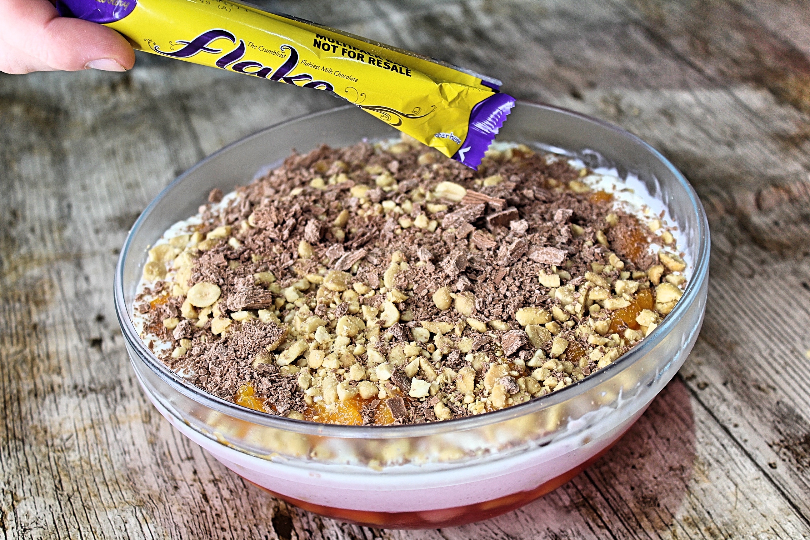 Do this last bit when you're nearly ready to serve to stop the toppings from getting soggy. Add the drained mandarin segments spread across the top neatly then add crushed flake and the crushed peanuts and serve.