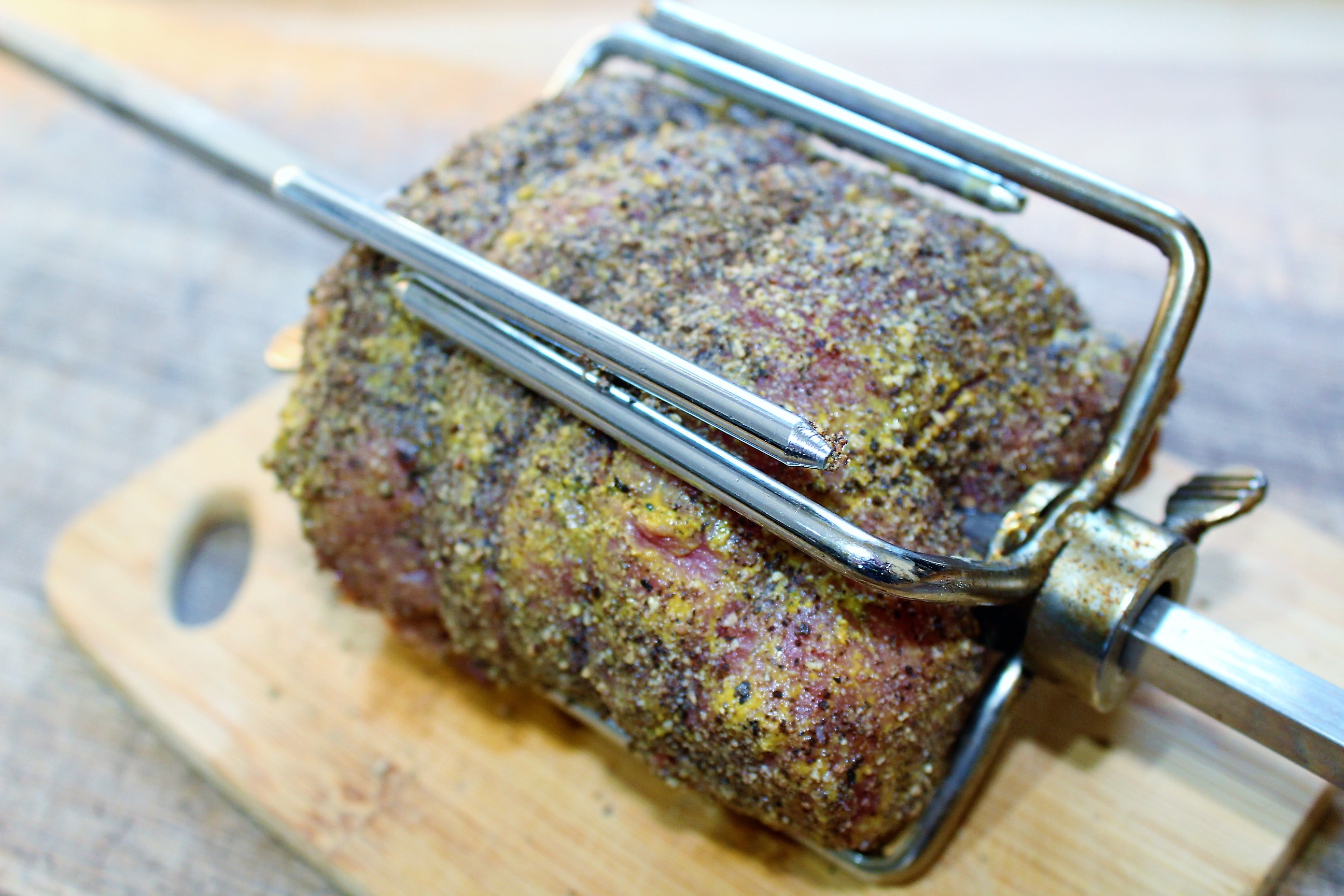 I gave the joint a good coat of Colemans English mustard before seasoning all sides with smoked salt and crushed black pepper and spearing it up ready for the rotisserie. I let that little bugger spin away until the internal temperature hit 55C.