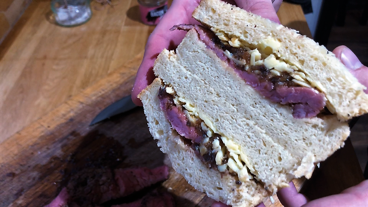 As always I let the meat rest for a good ten minutes to let the juices redistribute around the meat before slicing super thin and serving with cheese and bacon jam between fluffy white bread.