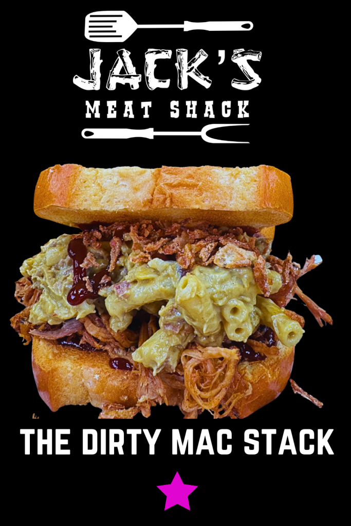 The Dirty Mac Stack is what happens when you stop pretending you want balance… and just go all in. We’re talking layers of creamy, cheesy mac ’n’ cheese — rich, soft, completely indulgent — stacked with smoky pulled pork and crispy bacon that brings the salt, the crunch, and just enough attitude to keep things interesting. Then it all gets sandwiched between thick slices of buttery, toasted bread… and pressed just enough for everything inside to melt together into one ridiculous, oozing stack.
