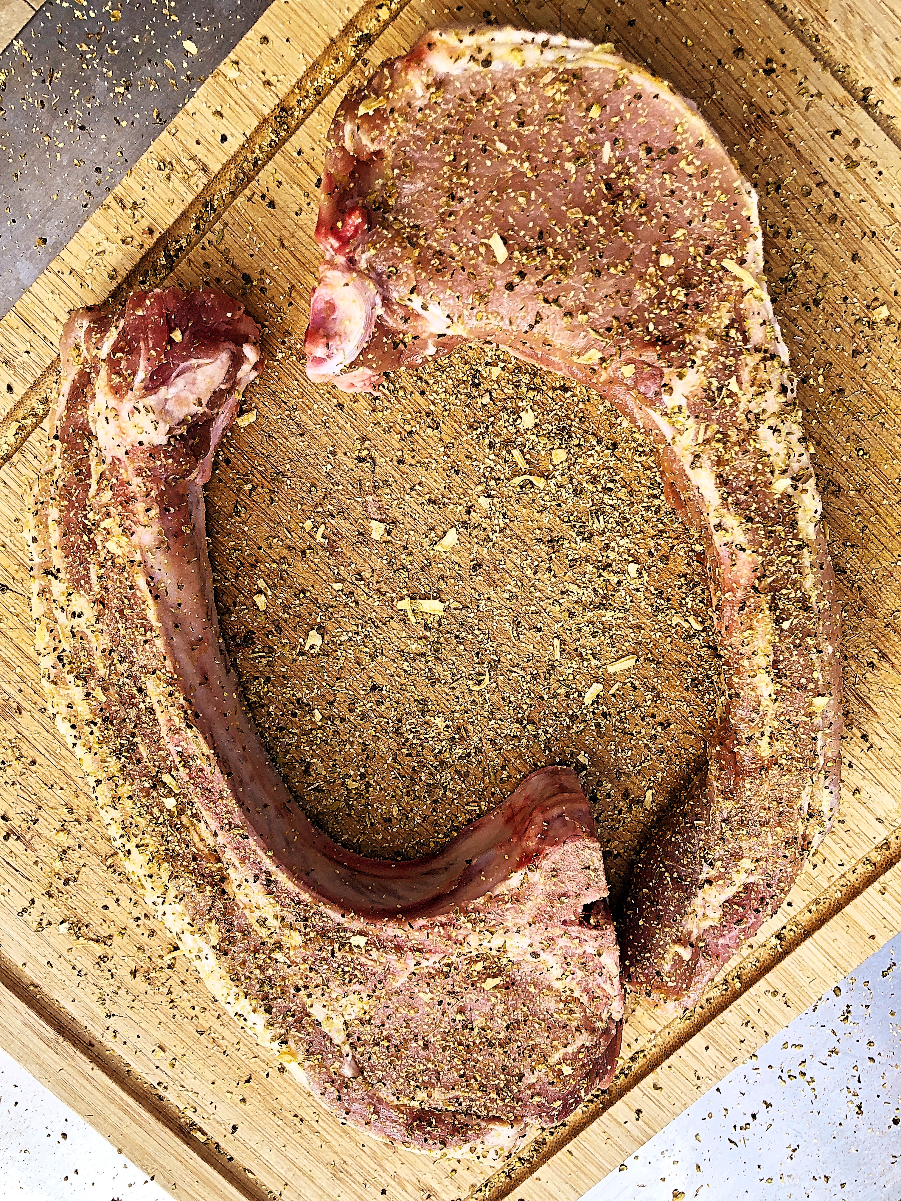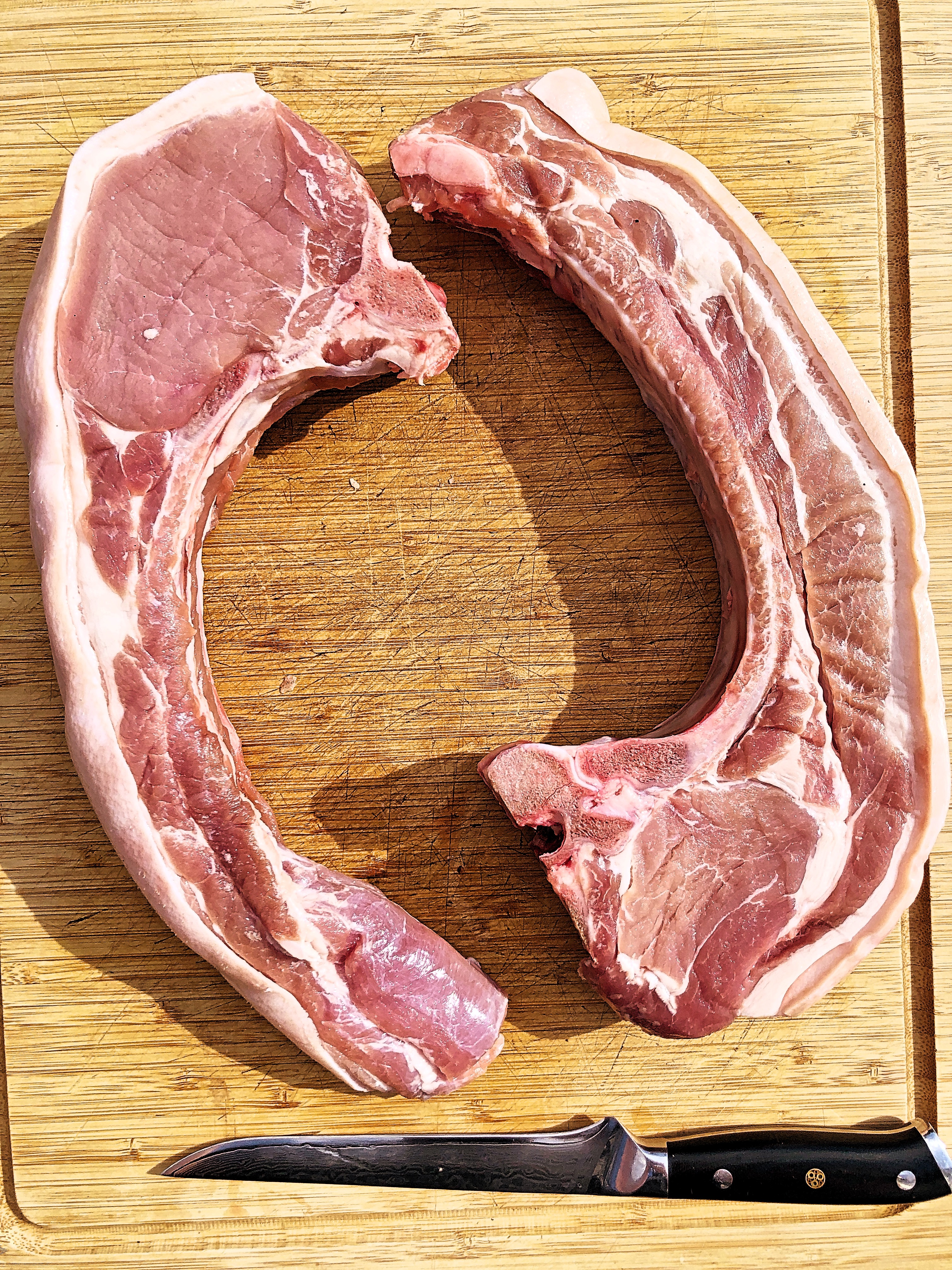 A pork tomahawk or affectionately known as the "TOMAPORK" is essentially a pork loin steak with the belly still attached. Talk about best of both worlds - the meaty goodness of a pork chop with all that tasty fat from te pork belly.