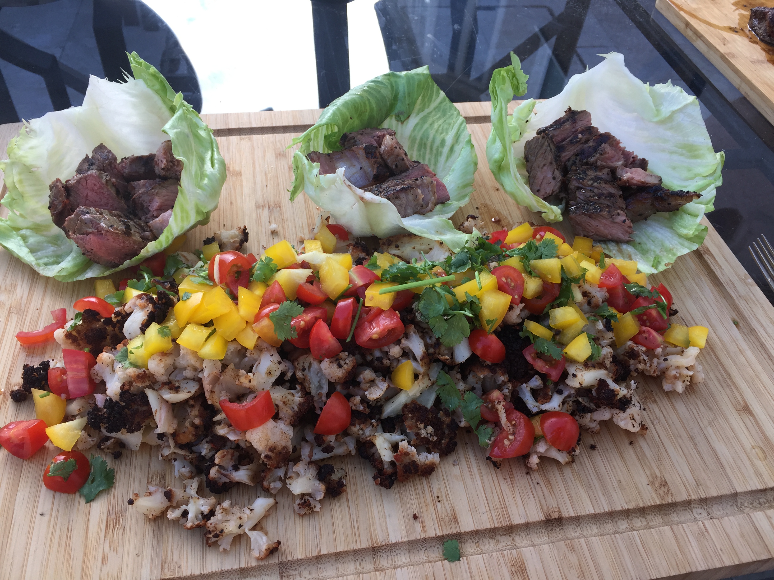 I’ve served it up as a Cauliflower “salsa” topped with chopped plum tomatoes, yellow peppers and coriander grown freshly from the garden. All served with some tasty steak lettuce tacos. Yum!